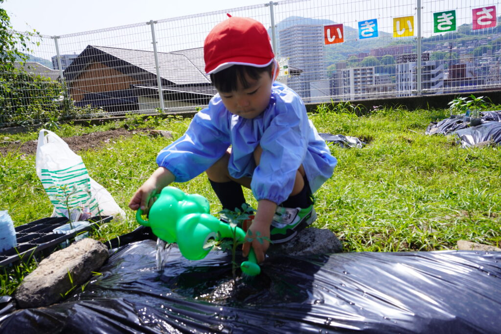 まだまだ小さな苗なので、「どこからトマトが出てくるの~?」と言っている子どもたちです。毎日お世話する中で、年齢に応じて様々な発見や喜びを味わうことでしょう😊 楽しみだな~!