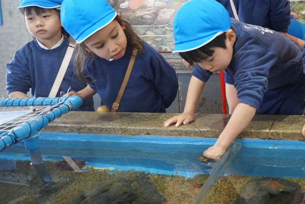 海の生き物に触れられるコーナーでは、ヒトデやナマコ、ヤドカリに実際に触ってみました😊