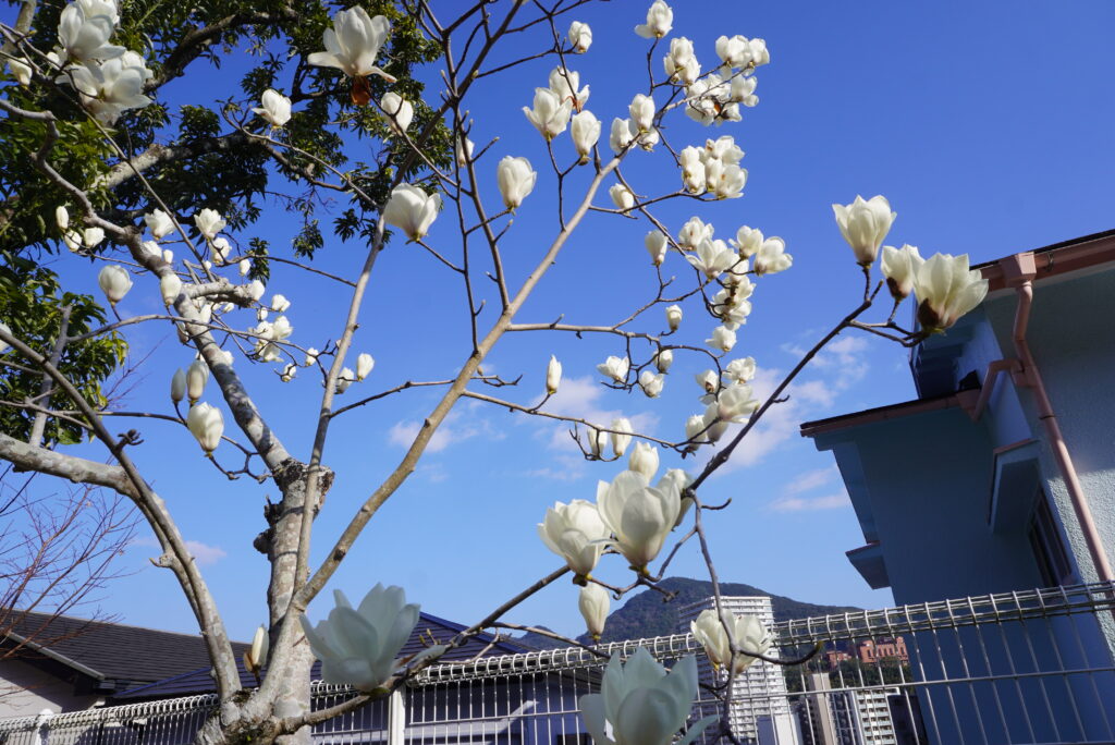 年長児の卒園をお祝いするように毎年この時期に咲くあんず木蓮が、今年も綺麗な花をたくさんつけました😊