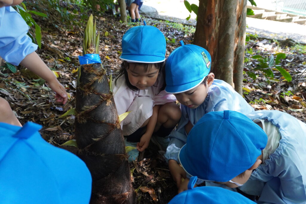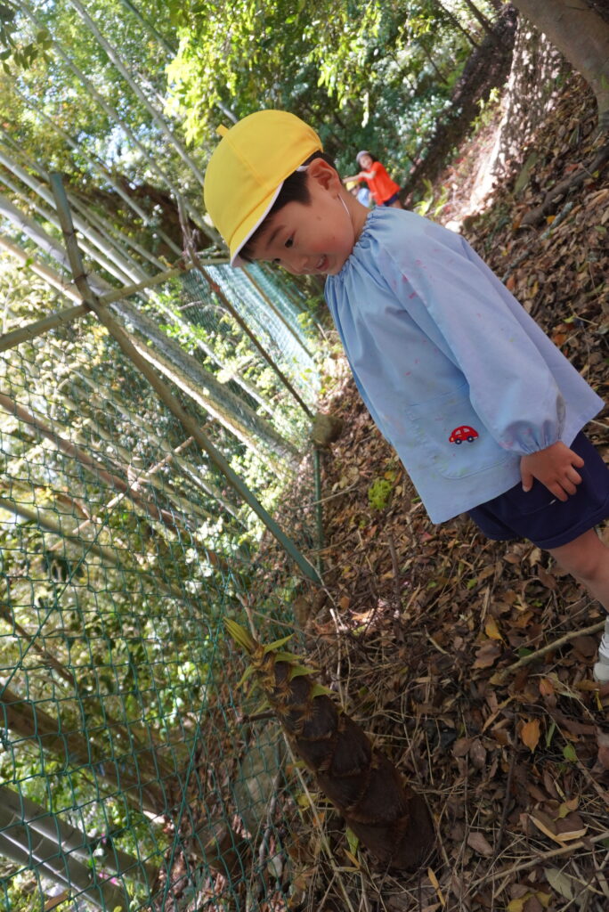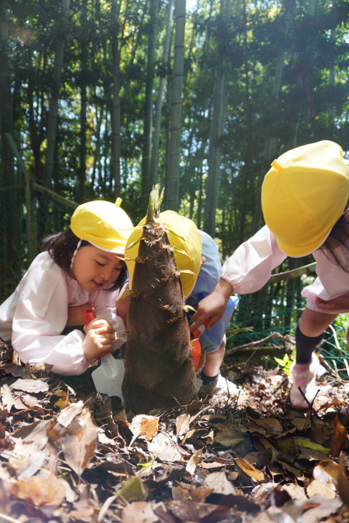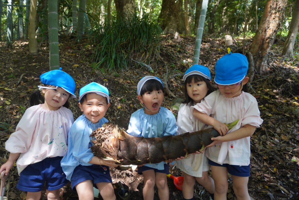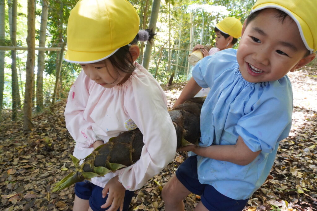 根っこまで少しずつ一生懸命掘ろうとする子、早く掘りたくて「もうこの辺で折ったらいいんじゃない?」という子…いろいろな考え方があるのね😊たけのこの掘り方でも個性がでますね😊でも、たけのこを掘って持って帰りたいという目的は同じの子どもたち✨みんなで力をあわせて頑張りました!