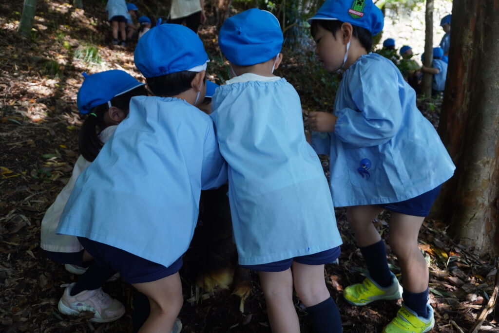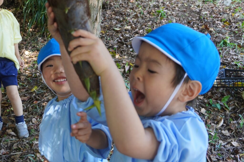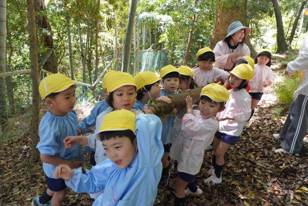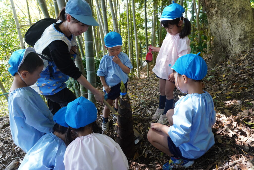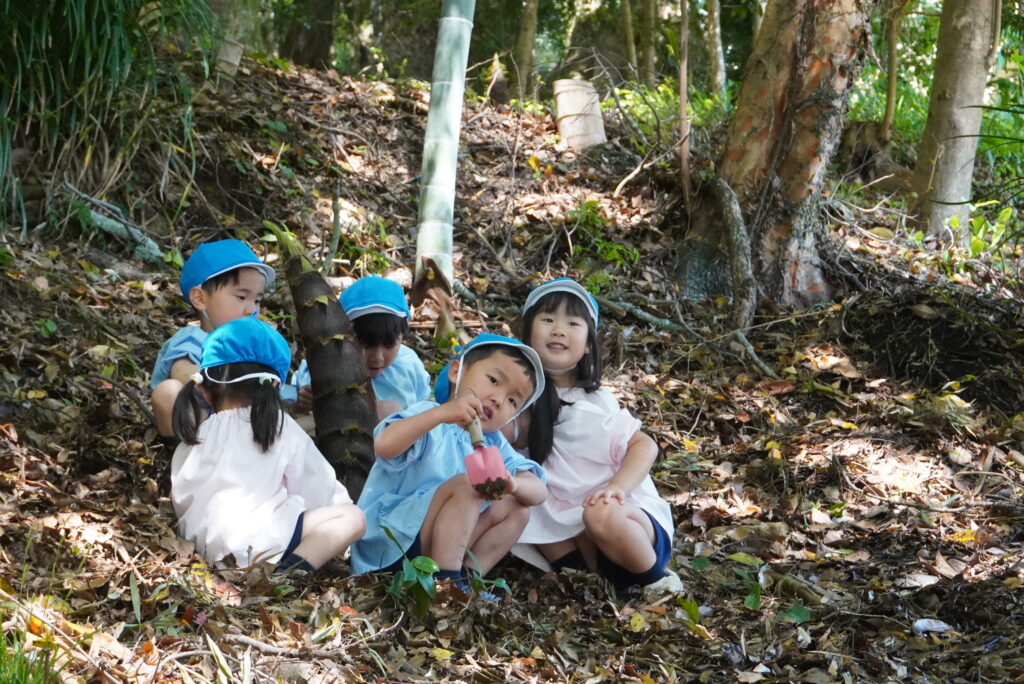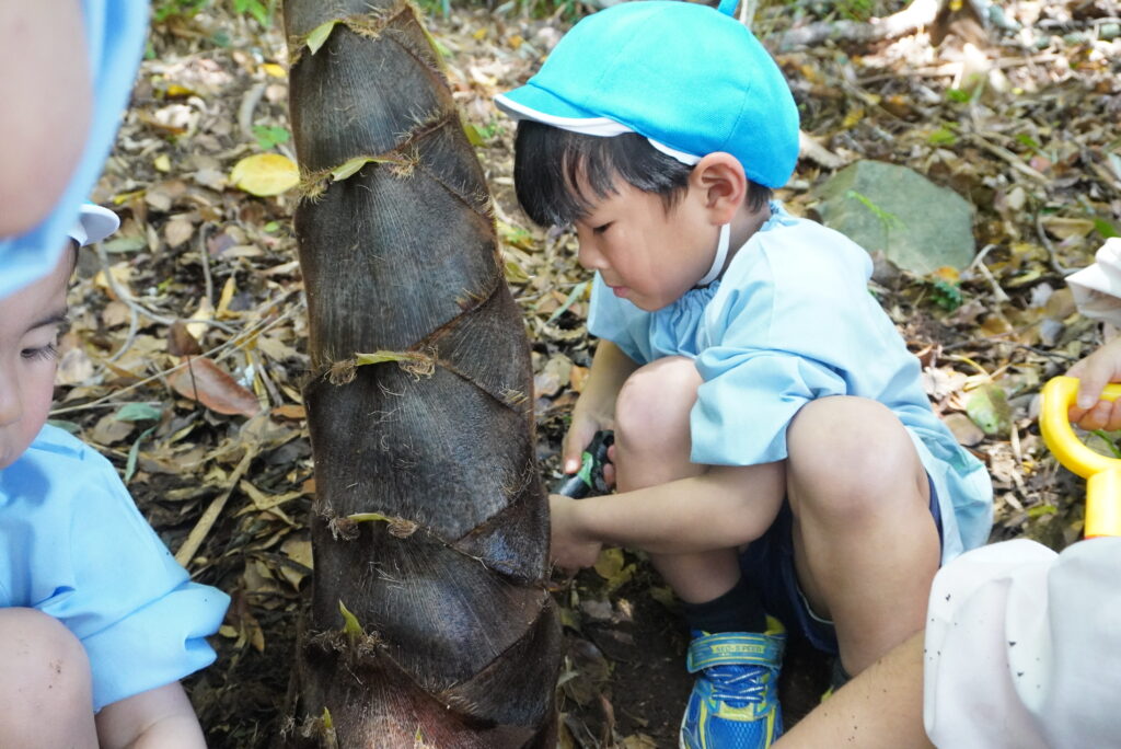 根っこまで少しずつ一生懸命掘ろうとする子、早く掘りたくて「もうこの辺で折ったらいいんじゃない?」という子…いろいろな考え方があるのね😊たけのこの掘り方でも個性がでますね😊でも、たけのこを掘って持って帰りたいという目的は同じの子どもたち✨みんなで力をあわせて頑張りました!